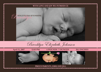 Mommy Photography offers a variety of products which include custom designs with her photography. From artistic collages to carefully created Birth Announcements, Birthday and Greeting Cards. Every design is personally created by Ali and is completely custom creating a unique piece of art.